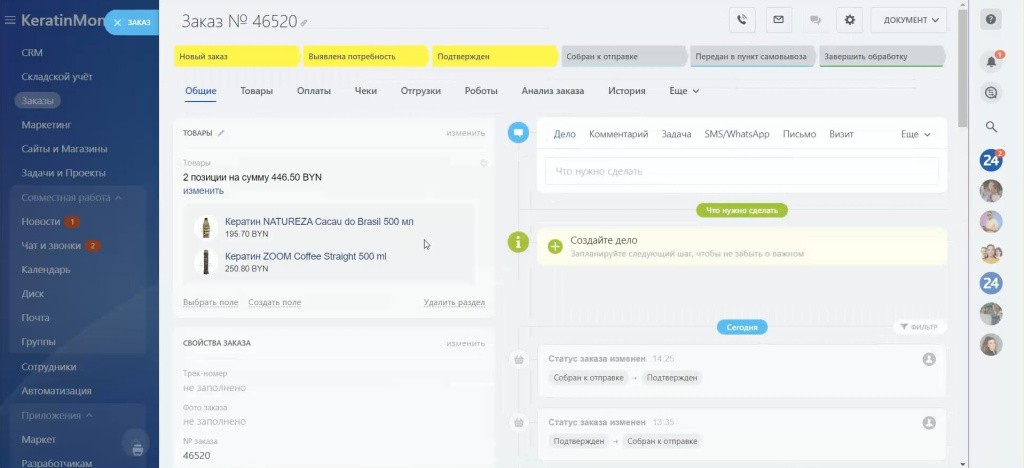 Созданы этапы обработки заказов от поступления до закрытия, настроены поля сделок и контактов, автоматические уведомления и контрольные точки. Реализована логика обработки статусов, сервисных полей и связанных документов, что позволило исключить ошибки при работе сотрудников.