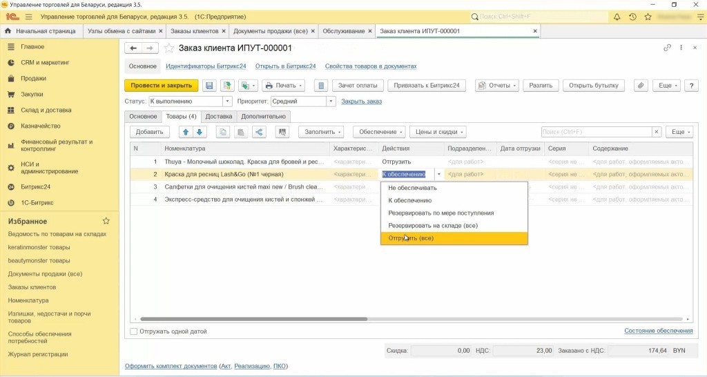 Настроена полная синхронизация клиентской базы, реквизитов, заказов, статусов и действий менеджеров. Интегрированы документы реализации товаров и услуг, документы прихода денежных средств. Проведена проверка обмена на тестовой среде, корректировка структуры данных и устранение ошибок, мешавших корректной передаче информации.
