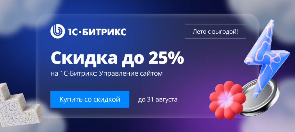 - Скидка 20% на лицензии «1С-Битрикс: Управление сайтом»: Старт, Стандарт, Малый бизнес, Бизнес
